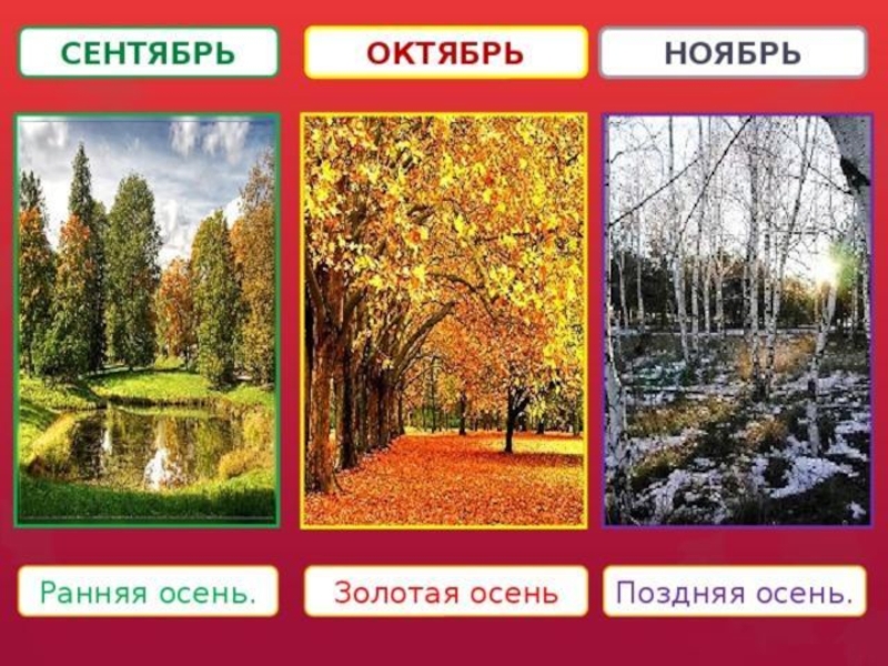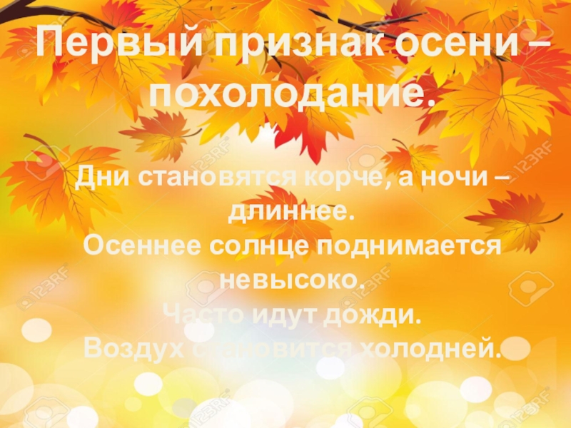 Первый признак осени – похолодание.Дни становятся корче, а ночи – длиннее.Осеннее солнце поднимается невысоко.Часто идут дожди.Воздух становится