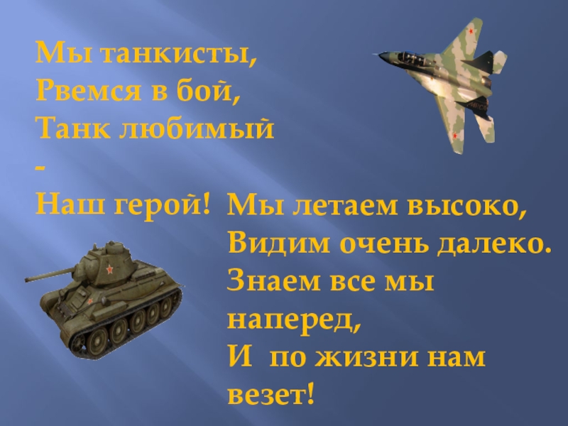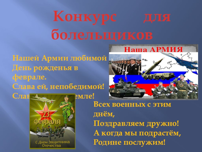 Всех военных с этим днём, Поздравляем дружно! А когда мы подрастём, Родине послужим!