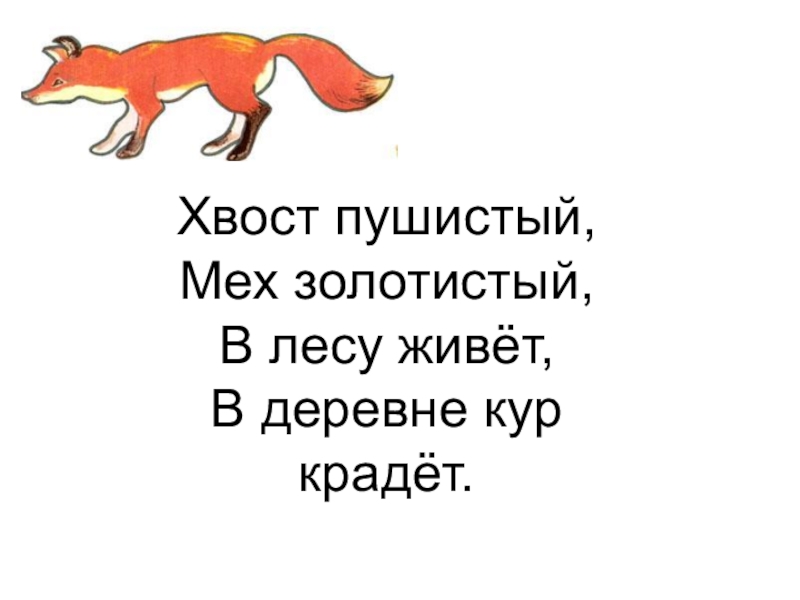 Слайд 2Хвост пушистый,  Мех золотистый,  В лесу живёт,  В деревне кур крадёт.