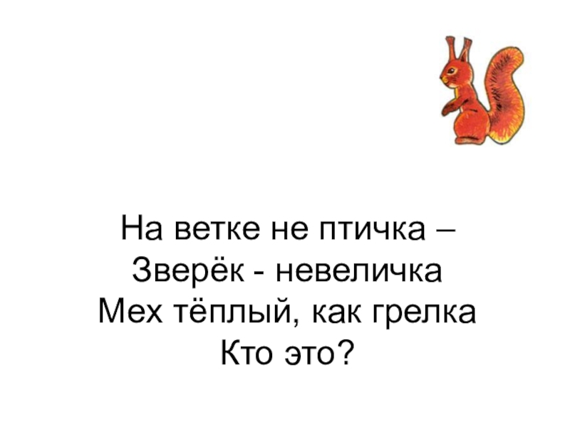 Слайд 5На ветке не птичка –  Зверёк - невеличка  Мех тёплый, как грелка  Кто это?