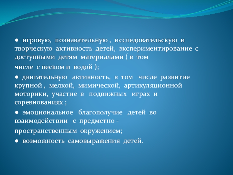 Слайд 6● игровую, познавательную , исследовательскую и творческую активность детей, экспериментирование