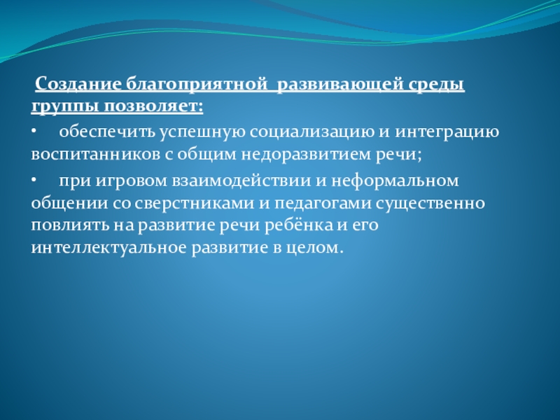 Создание благоприятной развивающей среды группы позволяет:•	обеспечить успешную социализацию и интеграцию воспитанников с общим недоразвитием речи;•	при игровом