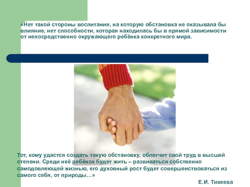 Тот, кому удастся создать такую обстановку, облегчит свой труд в высшей степени. Среди неё ребёнок будет жить – развиваться собственно самодовлеющей жизнью, его духовный рост будет совершенствоваться из самого себя, от природы…»