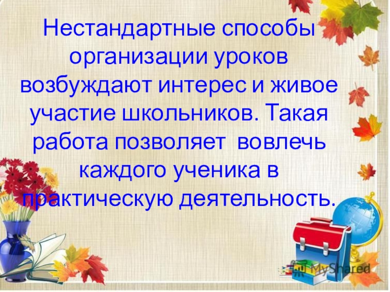 Нестандартные способы организации уроков возбуждают интерес и живое участие школьников. Такая работа позволяет вовлечь каждого ученика в