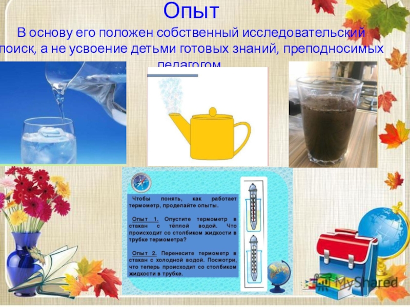 ОпытВ основу его положен собственный исследовательский поиск, а не усвоение детьми готовых знаний, преподносимых педагогом.