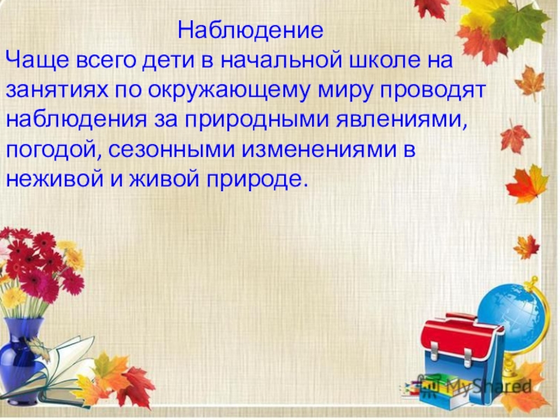 НаблюдениеЧаще всего дети в начальной школе на занятиях по окружающему миру проводят наблюдения за природными явлениями, погодой,