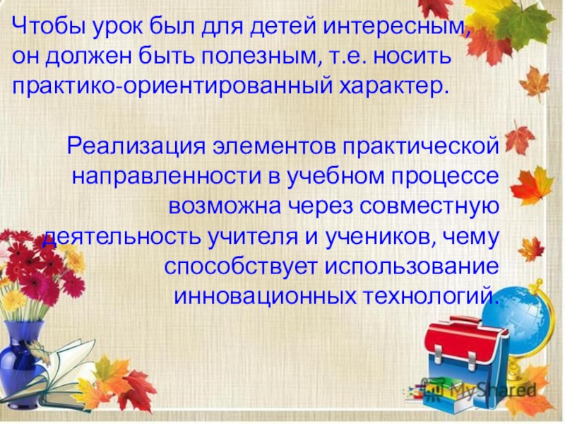 Чтобы урок был для детей интересным, он должен быть полезным, т.е. носить практико-ориентированный характер.Реализация элементов практической направленности в учебном процессе возможна через совместную деятельность учителя и учеников, чему способствует использование инновационных технологий.