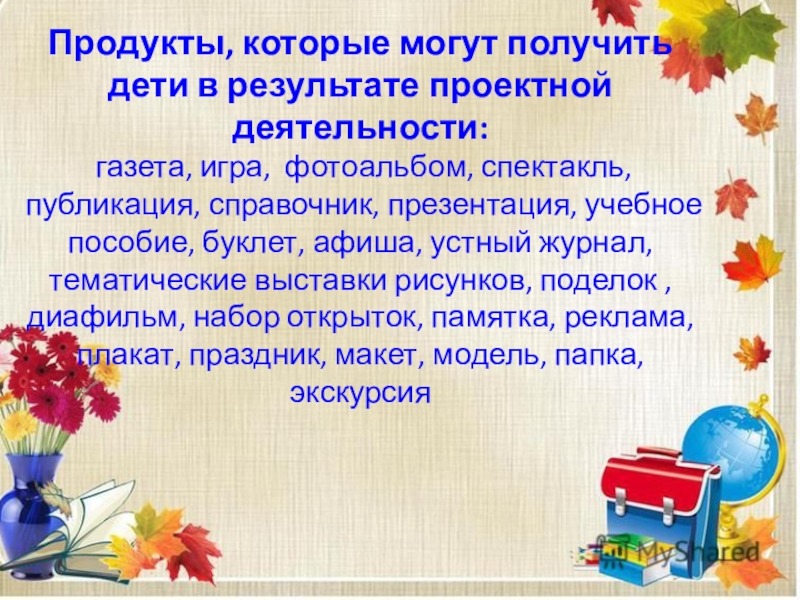 Продукты, которые могут получить дети в результате проектной деятельности: газета, игра, фотоальбом, спектакль, публикация, справочник, презентация, учебное