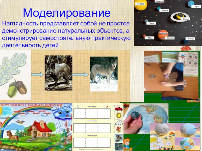 МоделированиеНаглядность представляет собой не простое демонстрирование натуральных объектов, а стимулирует самостоятельную практическую деятельность детей