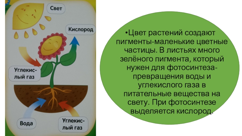 Цвет растений создают пигменты-маленькие цветные частицы. В листьях много зелёного пигмента, который нужен для фотосинтеза-превращения воды и углекислого газа в питательные вещества на свету. При фотосинтезе выделяется кислород.