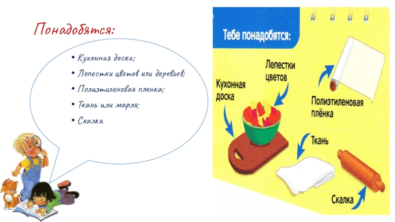 Понадобятся:Кухонная доска;Лепестки цветов или деревьев;Полиэтиленовая пленка;Ткань или марля;Скалка