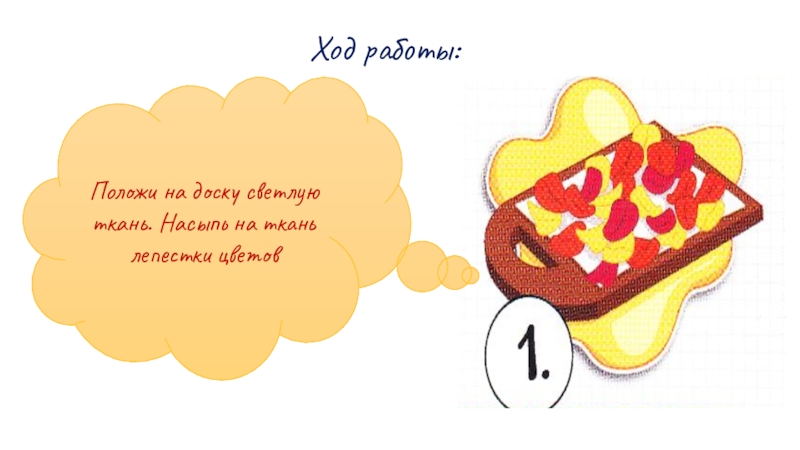 Ход работы:Положи на доску светлую ткань. Насыпь на ткань лепестки цветов