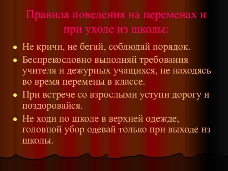 Слайд 7Правила поведения на переменах и при уходе из школы: