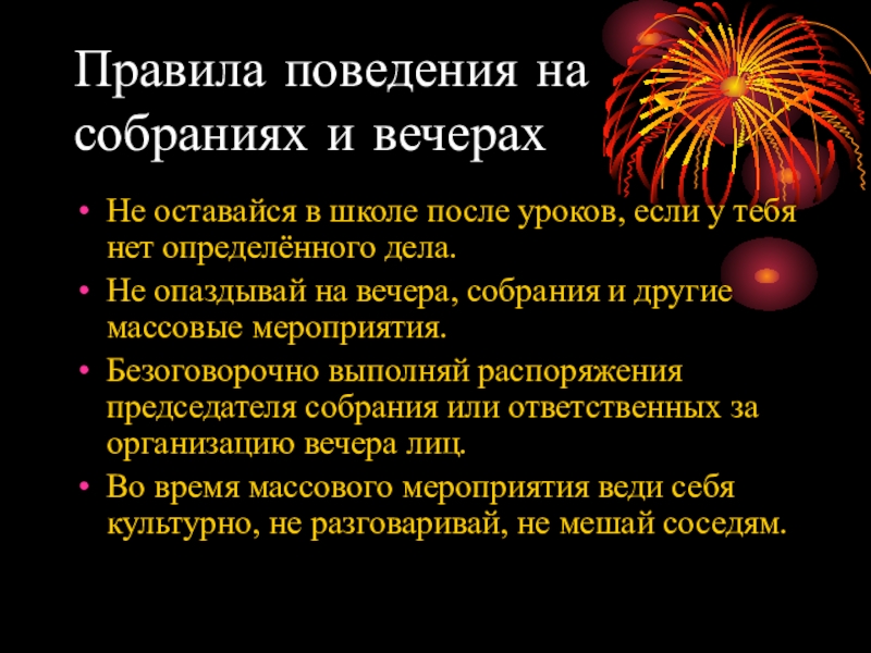 Не опаздывай на вечера, собрания и другие массовые мероприятия.