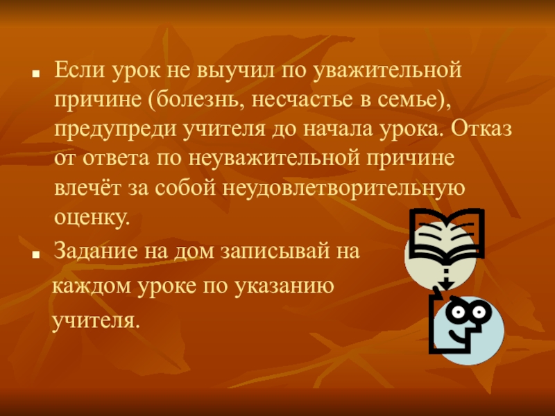Слайд 5Если урок не выучил по уважительной причине (болезнь, несчастье в семье),