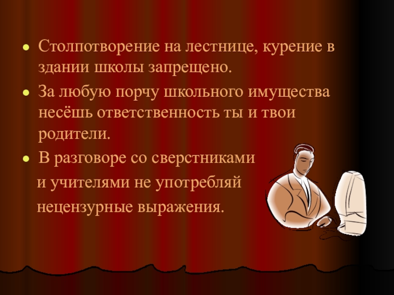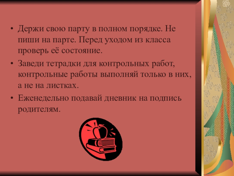 Слайд 12Держи свою парту в полном порядке. Не пиши на парте. Перед