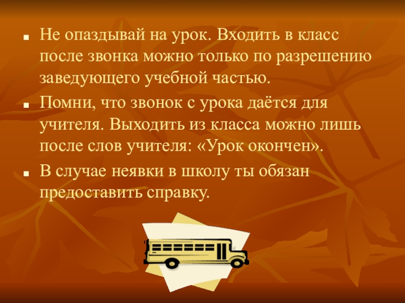 Слайд 6Не опаздывай на урок. Входить в класс после звонка можно только