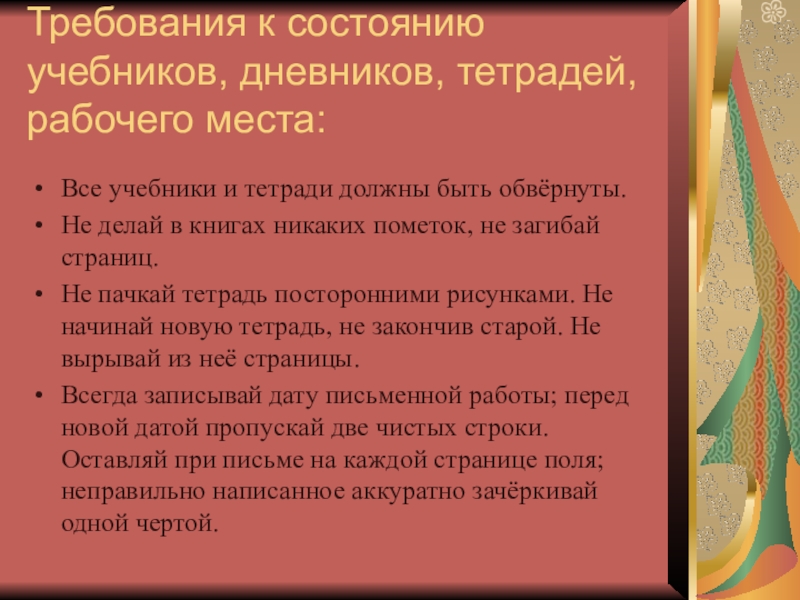 Слайд 11Требования к состоянию учебников, дневников, тетрадей, рабочего места: