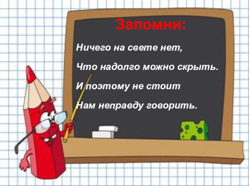 Запомни:Ничего на свете нет, Что надолго можно скрыть.И поэтому не стоит Нам неправду говорить.
