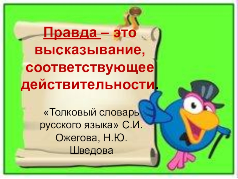 Правда – это высказывание, соответствующее действительности.«Толковый словарь русского языка» С.И.Ожегова, Н.Ю.Шведова