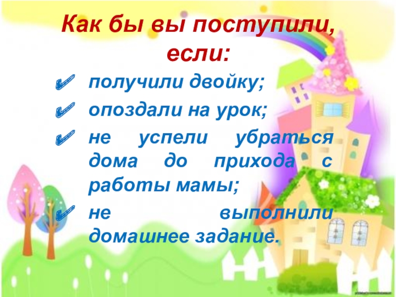 Как бы вы поступили, если:получили двойку;опоздали на урок;не успели убраться дома до прихода с работы мамы;не выполнили