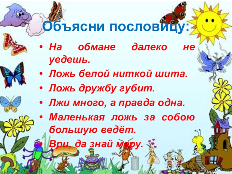 Объясни пословицу:На обмане далеко не уедешь.Ложь белой ниткой шита.Ложь дружбу губит.Лжи много, а правда одна.Маленькая ложь за