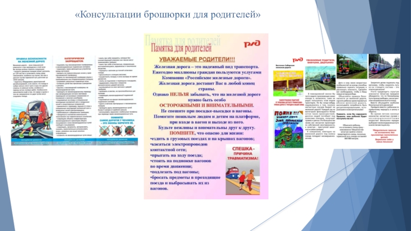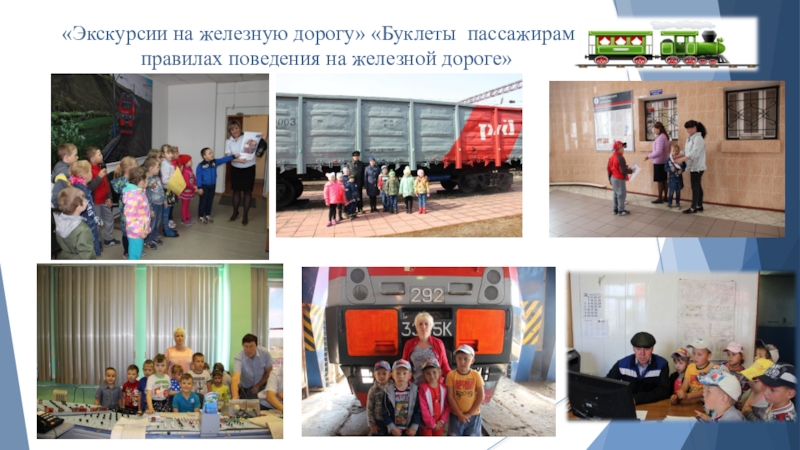 Слайд 12«Экскурсии на железную дорогу» «Буклеты пассажирам о правилах поведения на железной