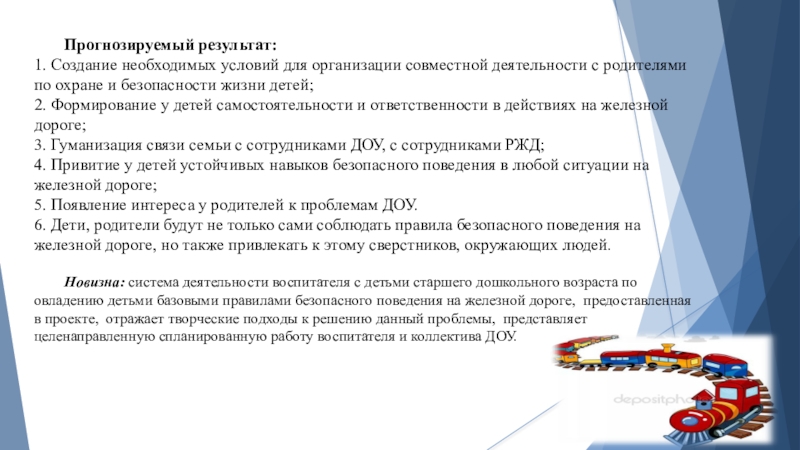 Новизна: система деятельности воспитателя с детьми старшего дошкольного возраста по овладению детьми базовыми правилами безопасного поведения на железной дороге, предоставленная в проекте, отражает творческие подходы к решению данный проблемы, представляет целенаправленную спланированную работу воспитателя и коллектива ДОУ.