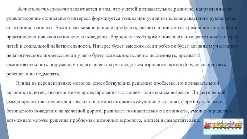 Одним из перспективных методов, способствующих решению проблемы, по познавательной активности детей, является метод проектирования в старшем дошкольном возрасте. Дидактический смысл проекта заключается в том, что он помогает связать обучение с жизнью, формирует навыки безопасного поведения на железной дороге, развивает познавательную активность, умение определять возможные методы решения проблемы с помощью взрослого, а затем и самостоятельно.