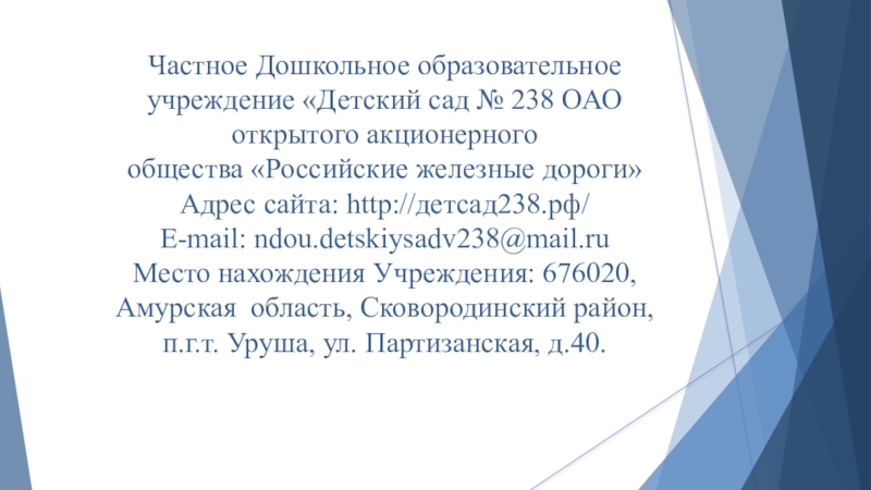 Слайд 1Частное Дошкольное образовательное учреждение «Детский сад № 238 ОАО открытого акционерного