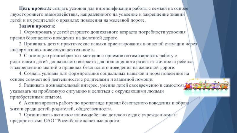 двухстороннего взаимодействия, направленного на усвоение и закрепление знаний детей и их родителей о правилах поведения на железной дороге.