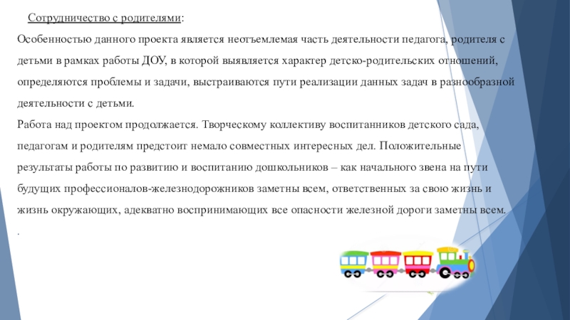Работа над проектом продолжается. Творческому коллективу воспитанников детского сада, педагогам и родителям предстоит немало совместных интересных дел. Положительные результаты работы по развитию и воспитанию дошкольников – как начального звена на пути будущих профессионалов-железнодорожников заметны всем, ответственных за свою жизнь и жизнь окружающих, адекватно воспринимающих все опасности железной дороги заметны всем.