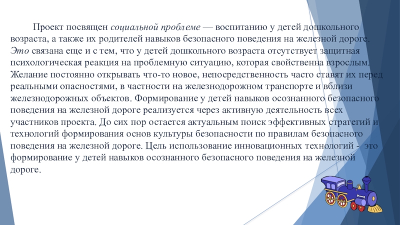 Проект посвящен социальной проблеме — воспитанию у детей дошкольного возраста, а также их родителей навыков безопасного поведения на железной дороге. Это связана еще и с тем, что у детей дошкольного возраста отсутствует защитная психологическая реакция на проблемную ситуацию, которая свойственна взрослым. Желание постоянно открывать что-то новое, непосредственность часто ставят их перед реальными опасностями, в частности на железнодорожном транспорте и вблизи железнодорожных объектов. Формирование у детей навыков осознанного безопасного поведения на железной дороге реализуется через активную деятельность всех участников проекта. До сих пор остается актуальным поиск эффективных стратегий и технологий формирования основ культуры безопасности по правилам безопасного поведения на железной дороге. Цель использование инновационных технологий - это формирование у детей навыков осознанного безопасного поведения на железной дороге.