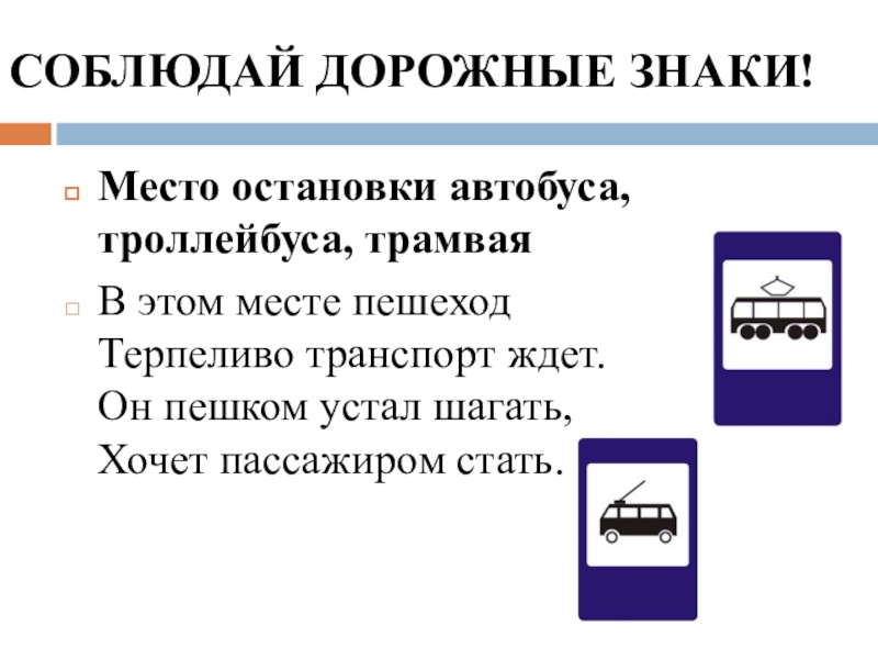СОБЛЮДАЙ ДОРОЖНЫЕ ЗНАКИ!Место остановки автобуса, троллейбуса, трамваяВ этом месте пешеход Терпеливо транспорт ждет. Он пешком устал шагать,