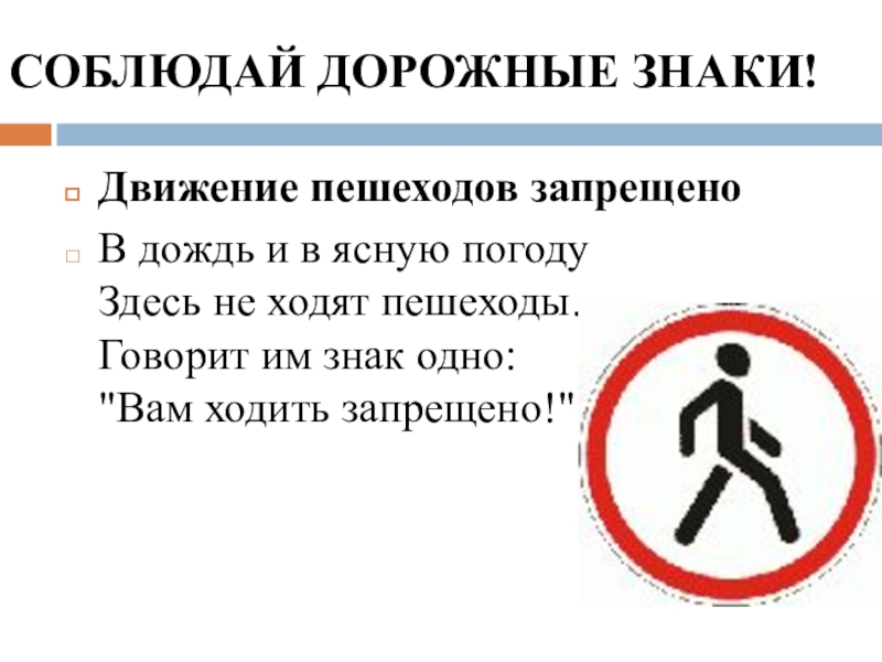 СОБЛЮДАЙ ДОРОЖНЫЕ ЗНАКИ!Движение пешеходов запрещеноВ дождь и в ясную погоду Здесь не ходят пешеходы. Говорит им знак