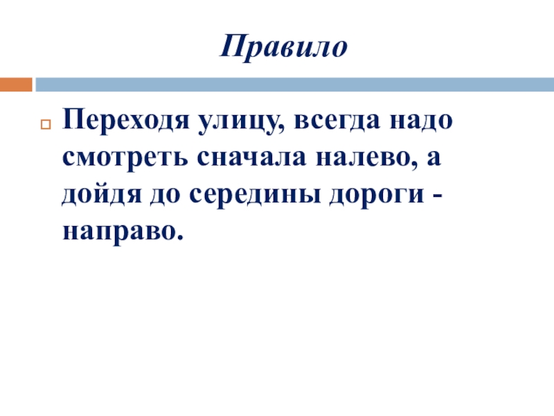 ПравилоПереходя улицу, всегда надо смотреть сначала налево, а дойдя до середины дороги - направо.