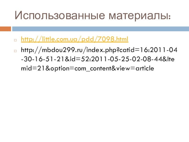 Использованные материалы:http://little.com.ua/pdd/7098.htmlhttp://mbdou299.ru/index.php?catid=16:2011-04-30-16-51-21&id=52:2011-05-25-02-08-44&Itemid=21&option=com_content&view=article