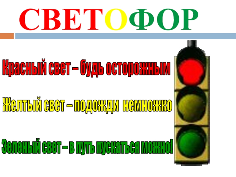 СВЕТОФОРКрасный свет – будь осторожнымЖелтый свет – подожди немножкоЗеленый свет – в путь пускаться можно!