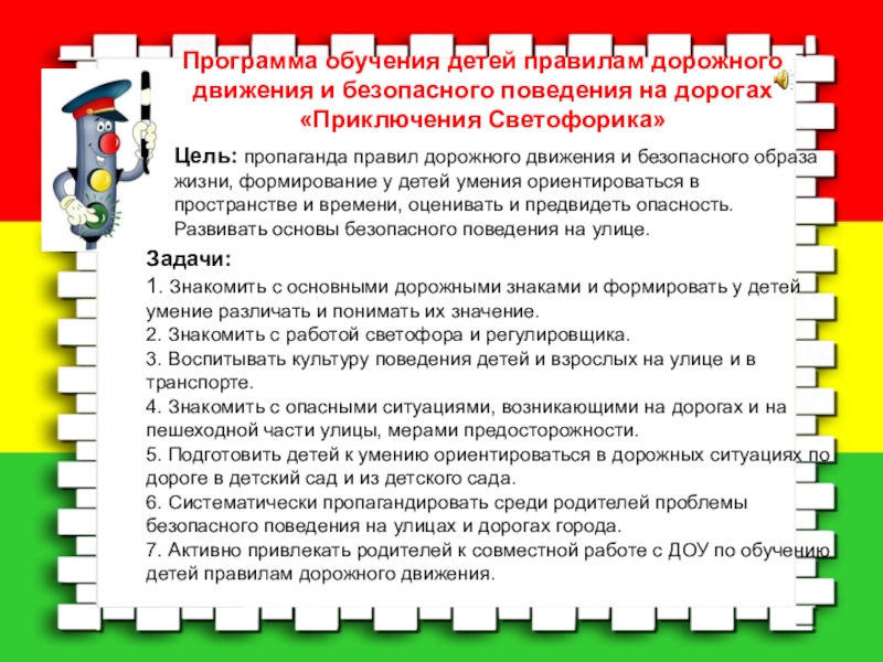 Цель: пропаганда правил дорожного движения и безопасного образа жизни, формирование у детей умения ориентироваться в пространстве и времени, оценивать и предвидеть опасность. Развивать основы безопасного поведения на улице.