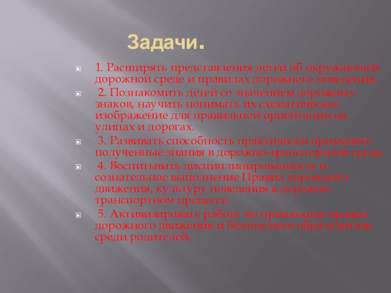 Задачи.1. Расширять представления детей об окружающей дорожной среде и правилах дорожного поведения. 2. Познакомить детей со значением