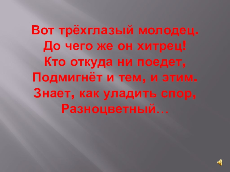 Слайд 11Вот трёхглазый молодец. До чего же он хитрец! Кто откуда ни поедет, Подмигнёт и