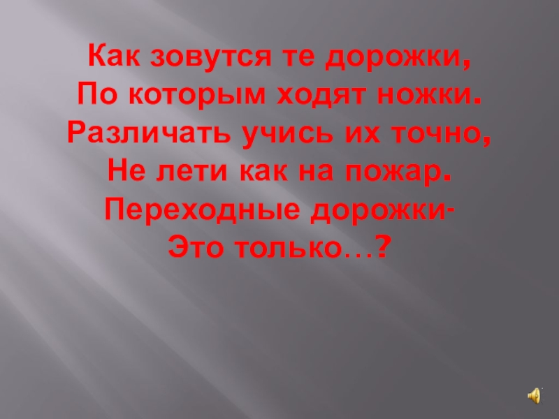 Как зовутся те дорожки, По которым ходят ножки. Различать учись их точно, Не лети как на пожар.