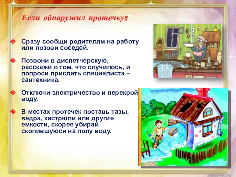 В местах протечек поставь тазы, ведра, кастрюли или другие емкости, скорее убирай скопившуюся на полу воду.