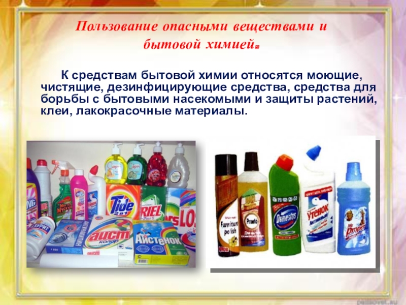 Пользование опасными веществами и бытовой химией.
