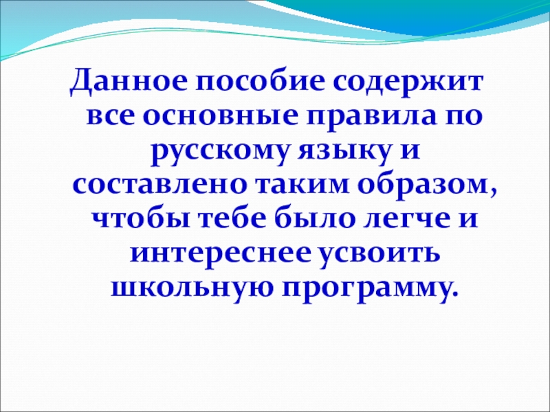 Слайд 2Данное пособие содержит все основные правила по русскому языку и составлено