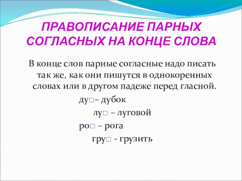 Слайд 6ПРАВОПИСАНИЕ ПАРНЫХ СОГЛАСНЫХ НА КОНЦЕ СЛОВА