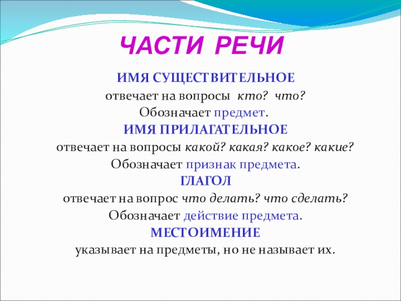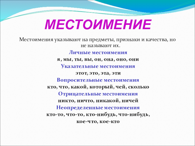 Местоимения указывают на предметы, признаки и качества, но не называют их.
