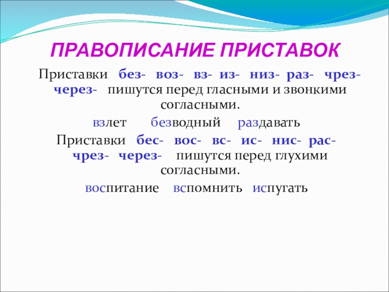 Приставки бес- вос- вс- ис- нис- рас- чрез- через- пишутся перед глухими согласными.