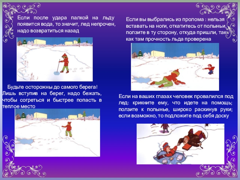Если на ваших глазах человек провалился под лед: крикните ему, что идете на помощь; ползите к полынье, широко раскинув руки; если возможно, то подложите под себя доску