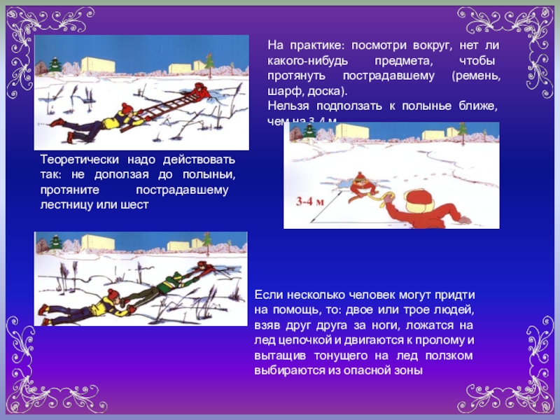 На практике: посмотри вокруг, нет ли какого-нибудь предмета, чтобы протянуть пострадавшему (ремень, шарф, доска).